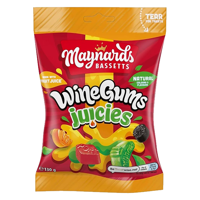 Delicious fruit-flavoured chewy gums made in a variety of dazzling colours, stamped with signature wine labels. Irresistible wine gums but now with more juice!. Whether you're trying them for the first time or reliving childhood sweetshop memories, you're bound to find your favourite.